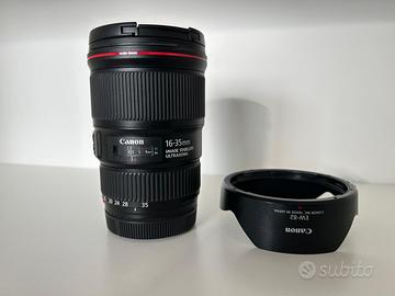 Vendo obiettivo Canon EF 16-35mm f/4L IS USM. Perfettamente funzionante. Qualche minimo segno di usura esterno come da normale utilizzo, nessun graffio o segni di muffa nelle lenti. Usato sempre con filtro UV. Compresi nel prezzo: obiettivo CANON EF 16-35mm f/4L IS USM; scatola originale; paraluce originale Canon EW 82.