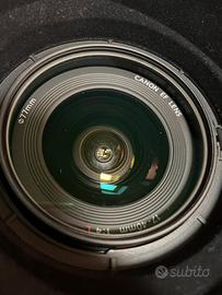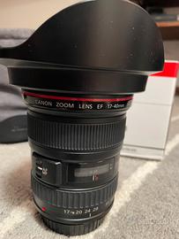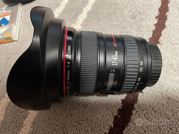 Obiettivo Canon EF 17-40mm f/4L USM Includo filtro Hoya HMC UV(C) 77mm. Scatola, sacca di trasporto e stoccaggio, e documentazione e dvd inclusi. Ottime condizioni, filtro applicato fin da subito per evitare segni sulla lente, non visibili polvere od altro, usato poco ma periodicamente per preservare lubrificazione ghiere, piccoli segni esterni sul paraluce per il contatto con un velcro dello zainetto. Portate pure il vostro corpo macchina per provarlo. šScambio a mano in provincia e zone limitrofe š« No spedizioni