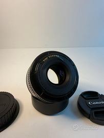 Obiettivo Canon EF 50mm f/1.8 II con paraluce metallico non originale. Perfettamente funzionante e in condizioni molto buone come da foto.