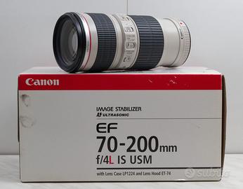 Vendo obiettivo Canon EF 70-200 F4 L IS USM. Lente della serie L che non ha bisogno di presentazioni, condizioni eccellenti, completo di paraluce, supporto per treppiede, scatola e accessori originali (sacca e cd con software Canon) Contatti attraverso app di Subito.it, consegna esclusivamente a mano, pagamento via Paypal o bonifico istantaneo