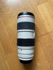 Obiettivo Canon EF 70-200mm f/2.8L IS USM, usato; in ottime condizioni e perfettamente funzionante. Completo di tappi, paraluce, staffa per cavalletto e borsa, tutti accessori originali.