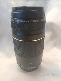 Canon EF 75-300mm f/4-5.6 III. Tipo: Teleobiettivo zoom adatto a fotocamere Canon reflex full frame e APS-C. Caratteristiche: Rivestimenti Super Spectra per ridurre flare e immagini fantasma, diaframma a 7 lamelle. Prestazioni: Apertura massima f/4-5.6, distanza minima di messa a fuoco di 1,5 metri. tappi originali, autofocus e lenti perfette