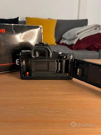 Vendo machina fotografica analogica Canon ef-m degli anni 90. Ha una crepa nella parte superiore. Fornita di manuali e scatola originale. La macchina scatta senza problemi.