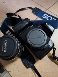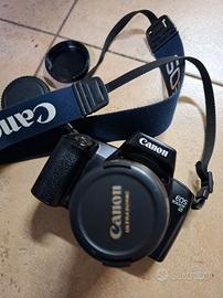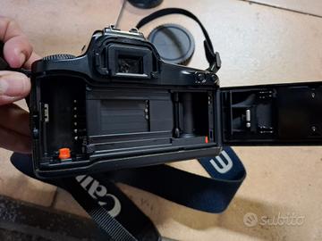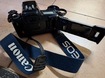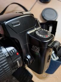 Canon eos 1000 f con obiettivo zoom 35/80. Analogica moderna, perfetto stato estetico sia del corpo macchina che dell'obiettivo, senza segni, muffa, etc. L'ultima volta che era stata utilizzata funzionava perfettamente, purtroppo qualche tempo fa le batterie interne sono andate perse.