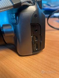 Vendo macchina fotografica Canon Eos 1100D con obiettivo 18-55. Incluso caricabatterie, cavo alimentazione, tracolla, memoria SD 8 GB. Normali segni di usura, mancante il pezzo in plastica a copertura della zona degli ingressi del cavo caricabatteria o Hdmi (vedi foto).