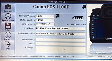 Fotocamera reflex Canon EOS 1100D in ottime condizioni, perfettamente funzionante. Ideale per chi vuole iniziare a fotografare con una reflex oppure come seconda macchina. 📊 Dettagli: ✔️ Scatti totali: circa 14.500 ✔️ Firmware aggiornato ✔️ Nessun problema tecnico 📸 Obiettivo incluso: •Canon EF-S 18-55mm f/4-5.6 IS STM (con stabilizzatore) 🎒 Accessori inclusi: •Borsa per trasporto (Amazon Basics) •Custodia originale Canon per obiettivo •Caricabatterie originale Canon •Batteria •Cavo USB •Telecomando per scatto a distanza •Schede di memoria incluse (SD 4GB + microSD 16GB con adattatore) •Lettore di schede USB •Tappi originali lente e corpo •Adattatore USB-C •Tracolla Canon 📦 Inclusi anche scatola originale e manuali 💡 Kit completo pronto all’uso: basta accendere e iniziare a fotografare subito, senza acquistare altro 💎 Fotocamera tenuta con cura, sempre conservata nella borsa 📍 Vendo per inutilizzo
