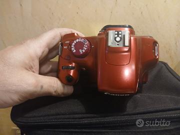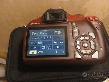 macchina fotografica digitale, Canon eos 1100d colore Rosso bordeaux metalizzato. Risoluzione: Dispone di un sensore APS-C da 12 megapixel.Processore d'immagine: Utilizza il processore DIGIC 4 a 14 bit, che garantisce rapidità e qualità dell'immagine.Sensibilità ISO: La gamma ISO va da 100 a 6.400, permettendo di scattare anche in condizioni di scarsa luminosità senza flash.Messa a fuoco: Sistema AF a 9 punti distribuito sull'inquadratura per una messa a fuoco accurata.Video: Supporta la registrazione di filmati, riproducibili anche su TV HD tramite connettore HDMI