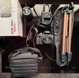 Canon EOS 2000D dotata di: • Batteria originale • Caricatore • Obiettivo Canon EF-S 18-55mm f/3.5-5.6 IS II • Canon Obiettivo Pancake EF-S 24 mm F/2.8 STM • Treppiedi • Tracolla • Scatola • Libretto istruzioni