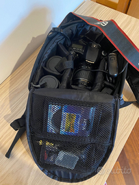 Reflex Canon EOS 30D completa di grandangolo TAMRON AF 17/50 F/2.8, Zoom Canon EF 55-200 Ultrasonic, 2 Batterie e 2 Caricabatterie di ricambio, Treppiedi, Filtro polarizzatore, Telecomando per scatto remoto, Memoria Trascend da 2 Gb, Memoria Sandisk da 512 Mb, cavi vari e zaino per il trasporto di tutti gli accessori.