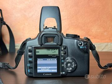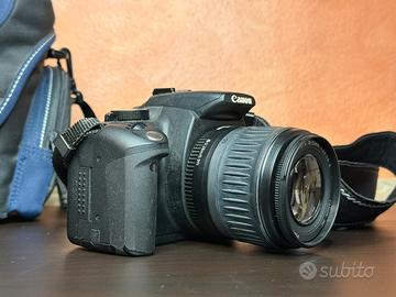 Canon EOS 350D con obiettivo EF-S 18-55mm II, fotocamera reflex digitale funzionante e in condizioni estetiche con normali segni di utilizzo come visibile nelle foto.