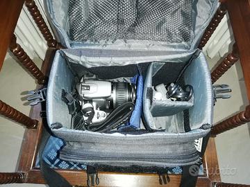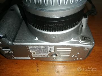 Fotocamera digitale Canon EOS 350D con obbiettivo Canon EF-S 18-88 mm. 1:3.5 - 5.6 completa di accessori (caricabatterie e cavo USB per scaricare le foto). Il corpo macchina è NUOVO e perfettamente funzionante. L'obbiettivo è in ottime condizioni e non presenta graffi sulle ottiche. Scheda di memoria Sandisk 2GB ultra. Vendo insieme a borsa professionale REPORTER PROFESSIONAL (misure L.27 - P.20 - H.24).