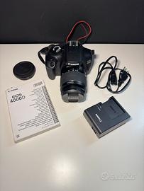 Vendo Canon EOS 4000D usata pochissimo, tenuta con cura. La macchina è in perfette condizioni estetiche e funzionali (ha una pellicola protettiva sullo schermo) Sono inclusi: Corpo macchina Canon EOS 4000D Libretto istruzioni originale Caricabatteria + cavo di alimentazione Batteria Borsa AmazonBasics per trasporto e protezione