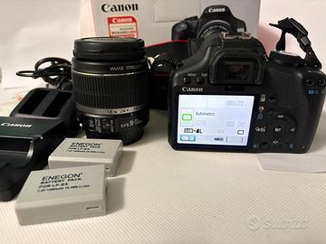 Vendo per poco uso, gli scatti lo testimoniano, reflex digitale Canon EOS 500D (sensore CMOS 15M) con il suo obiettivo in dotazione EF-S 18-55 IS (con Image Stabilizer). Oltre agli accessori forniti di base quando l'acquistai nuova (1 batteria + caricabatteria + manuale e cavetti vari) fornisco altre 2 batterie aggiuntive Enegon e relativo caricabatterie acquistate a luglio 2025, quindi nuove.