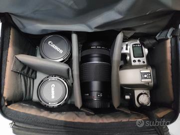 vendo macchina fotografica Canon EOS 500N in perfetto stato,in totale ha fatto una 20 di rullini, come si evince dalle foto è corredata di obiettivi originali Canon: 50mm 28/80mm 75/300mm tutti perfetti come nuovi