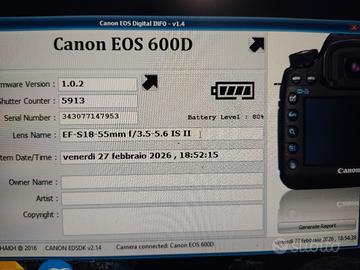 Vendo Canon EOS 600D in ottime condizioni completa di obiettivo kit 18-55, batteria, caricabatteria originali, cavi, scheda SD 32 GB, scatola e manualistica varia per passaggio ad altra macchina.