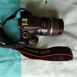 Corpo macchina con ob 17-85 con cinghia e custodia + ob canon 50mmF1,8 +ob tamrom AF 70-300 F 4-5.6 + tubi di raccordo e lenti addizionali per foto macro + tubi di prolunga per foto astronomica+ 3caricabatteie e 3 batterie + telecomando scatto + telecomando con intervallo euro + borsa per obiettivi e accessori.