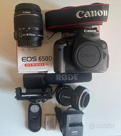 La 650D è una reflex fantastica per chi vuole fare foto e video di qualità . Include tutto per iniziare subito: due obiettivi (uno zoom versatile e uno fisso luminoso per effetto bokeh), microfono esterno per audio pulito, doppia batteria per non rimanere mai a secco.