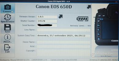 Reflex in ottime condizioni (tranne per la gomma dell oculare che si è tolta) sensore cmos digic 5 da 18 Mpx, 9 punti af, con lettura TTL spc a 63 zone, +/- 5 EV, iso 100 - 12800 espandibile a 25. .600 in modalità foto , touch screen da 3" pollici roteabile di 170°, file raw 14bit, af cmos hybrid phase detection, utilizzabile anche in modalità video full hd a 30fps, compatibile con le ottiche Canon EF e EF-S, viene fornita con batteria compatibile, caricatore originale e cinghia originale.