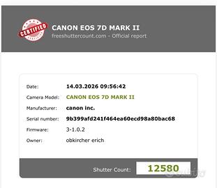 Vendo Canon EOS 7D Mark II in condizioni pari al nuovo. La fotocamera non presenta alcun graffio né segni di usura, lo stesso vale per entrambi i display. Tecnicamente è perfetta e il sensore è privo di polvere. Incluso nella vendita: •Canon EOS 7D Mark II •4 batterie •Caricabatterie •Tracolla Canon •Portabatterie per batterie standard (AA) La fotocamera è stata sempre utilizzata con grande cura ed è pronta all’uso.