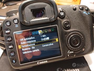 La Canon 7D è una fotocamera reflex con sensore APS-C (1.6x) da 18.0 megapixels prodotta dal 2009 al 2014 (fuori produzione). La gamma di sensibilità, inclusa estensione, è 100 - 12800 ISO e può scattare a raffica di 8 FPS x 15 RAW / 125 JPEG. Con batteria e caricabatteria, tracolla,