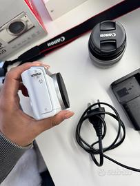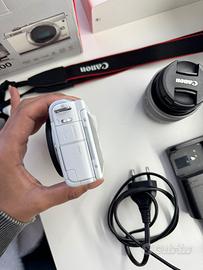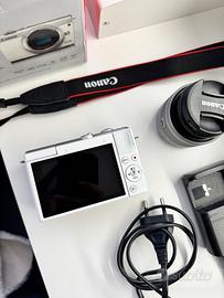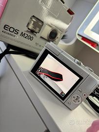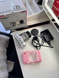 Vendo mirrorless Canon EOS M200 in versione bianca, elegante e compatta. E il kit completo mostrato in foto, perfetto per chi cerca una macchina fotografica potente ma tascabile. Il kit include esattamente tutto ciò che vedi nella foto principale: corpo macchina Canon EOS M200 (Bianco), obiettivo Canon EF-M 15-45mm IS STM (Argento), custodia protettiva in silicone colore Rosa Baby, tappo obiettivo, tracolla Canon (Nera/Rossa), caricabatterie originale con cavo di alimentazione, scatola originale del kit. La macchina è perfettamente funzionante e in ottimo stato estetico, sempre trattata con cura, le foto si passano tramite Wi-Fi/ bluetooth. Inoltre è reclinabile lo schermo per fare ottimi selfie.