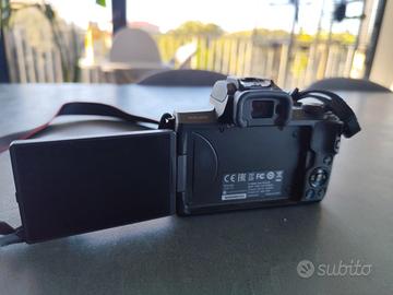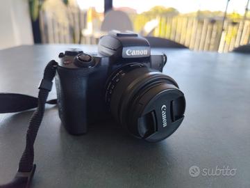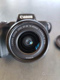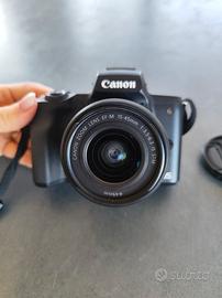 Canon EOS M50 – Mirrorless compatta (pari al nuovo) Vendo Canon EOS M50 usata pochissimo, sempre tenuta con cura, senza graffi. Caratteristiche principali: Sensore APS-C da 24,1 MP per immagini nitide e dettagliate Autofocus Dual Pixel rapido e preciso Schermo orientabile a 180° perfetto per vlog e selfie Mirino elettronico integrato Video Full HD e 4K Corpo compatto e leggero, facile da trasportare Condizioni: Corpo macchina in perfette condizioni, nessun difetto funzionale Batteria originale + caricabatterie Obiettivo 15-45mm incluso + Custodia Vendo per inutilizzo