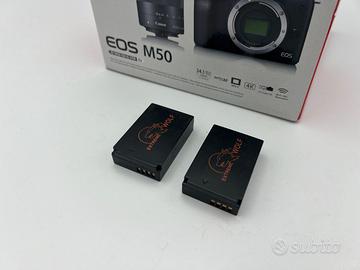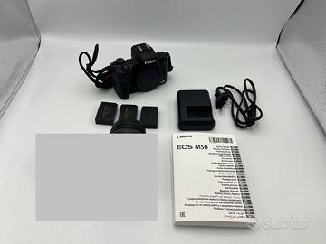 Canon EOS M50 mirrorless. Completa di scatola, batteria originale, caricabatterie e 2 batterie aggiuntive. Come nuova. NB: Obiettivo non incluso nella confezione. Solo corpo macchina.
