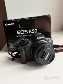 Vendo la mia Canon R50 causa passaggio ad altro modello. La macchina è praticamente nuova, non presenta graffi e tenuta sempre con la massima cura. Nel kit è incluso: • Corpo macchina Canon R50 • Obiettivo originale Canon RF-S 18-45mm STM • Batteria e caricabatterie originali • Tracolla Canon • Scatola originale