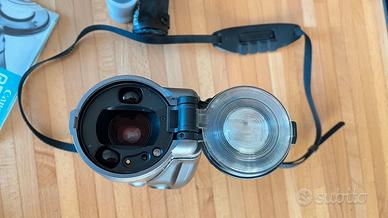 Forma compatta con cinghia laterale per infilarci tutto il palmo della mano ,pesa circa 7 etti.Impugnatura tipo videocamera e il flash all'interno del copri-obiettivo.