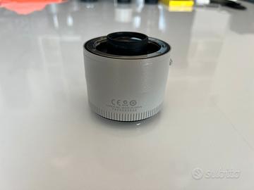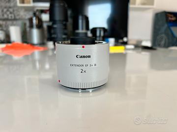 Canon Extender EF 2x III, accessorio originale Canon che raddoppia la lunghezza focale degli obiettivi compatibili, mantenendo autofocus e comunicazione elettronica con la fotocamera.