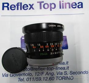 Obiettivo originale Canon FD 20 mm f/2.8 S.S.C. dedicato per fotocamere Reflex 35 mm Canon serie F/A/T. Obiettivo usato in buone condizioni estetiche e ben funzionante. Garanzia di mesi sei presso Reflex Top Linea sui difetti di funzionamento.