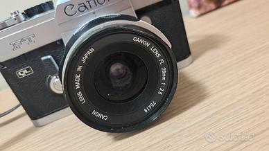 Vendo fotocamera analogica Canon FT QL con obiettivo Canon Lens FL 28mm f/3.5 e custodia rigida originale. La macchina è in buone condizioni estetiche generali, con normali segni del tempo. -Non è stata testata, quindi non posso garantire il funzionamento. Difetti: Obiettivo con ammaccatura frontale (visibile in foto) Possibile necessità di revisione generale Ideale per: collezionisti appassionati di fotografia analogica uso come pezzi di ricambio -Venduta così com’è. -Con custodia rigida inclusa. Disponibile subito, prezzo trattabile.