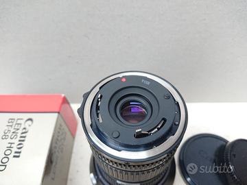 Canon New FD 35-70mm f/4 con paraluce in alluminio Canon W-62 (con scatola originale, che non è quella in foto, ma simile), senza graffi. La ghiera dello zoom è molto morbida, ma tutto funziona perfettamente.