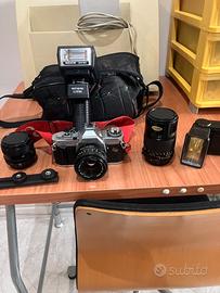 Vendo fotocamera Canon AV1 completa di obbiettivo da 28/50/135 mm + 2 Flash + 2 borse rigida e morbida ul tutto usato pochissimo perfettamente funzionante