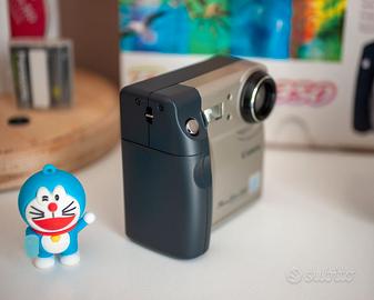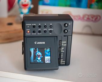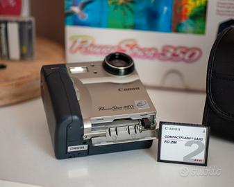 La Canon PowerShot 350 è una fotocamera digitale storica, lanciata originariamente nel 1997, è un pezzo da collezione vintage o definita anche fotocamera sperimentale per fotografia "lo-fi". La PowerShot 350 è una delle primissime fotocamere compatte di Canon, caratterizzata da un design unico quasi quadrato e un ingegnoso schermo LCD inclinabile da 1,8 pollici, una vera rarità. In condizioni pari al nuovo e completa di ogni suo accessorio originale, perfino le batterie ricaricabili che ovviamente hanno perso il loro potenziale di carica, custodia in tessuto nera orginale Canon, scheda CF Canon, manuali e cd software.