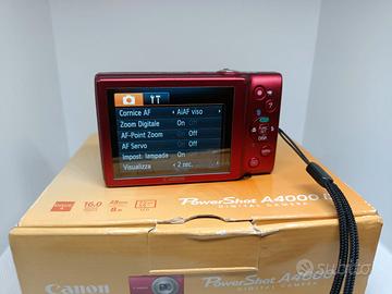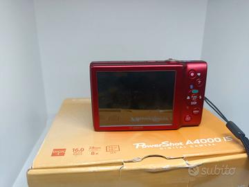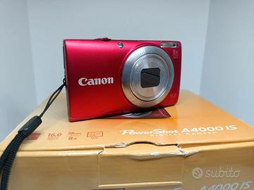Fotocamera Canon Powershot A4000 IS (PC1730) in ottime condizioni con scatola originale ed istruzioni. Con 1 batteria (usata) + 1 cavo usb. Si riceve ciò che è in foto. Canon PowerShot A4000 IS. Tipologia fotocamera: Fotocamera compatta, Megapixel: 16 MP, Dimensione del sensore di immagine: 1/2.3", Tipo sensore: CCD, Risoluzione massima immagine: 4608 x 3456 Pixel. Zoom ottico: 8x, Zoom digitale: 4x, Lunghezza focale: 5 - 40 mm. Velocità massima dell'otturatore della fotocamera: 1/2000 s. Tipologia HD: HD, Risoluzione massima video: 1280 x 720 Pixel. Dimensioni schermo: 7,62 cm (3"). PictBridge. Peso: 130 g. Colore del prodotto: Rosso Disponibili foto di esempio. NO GARANZIA, NO RESI