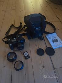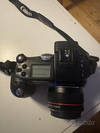 8 Megapixel, funzionante. La macchina monta l'obiettivo originale Serie L ed è venduta in blocco con un set completo di accessori che comprende l'aggiuntivo ottico grandangolare Canon, il paraluce a petalo, l'adattatore porta filtri e i relativi tappi di protezione neri. Il kit include inoltre il telecomando wireless originale per lo scatto a distanza, la tracolla, il manuale di istruzioni in italiano e la borsa fotografica Tamrac imbottita per il trasporto.