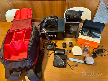 Vendesi Canon R5, obiettivo Canon RF 24-105mm f/4 L e Godox V1C, acquistat luglio 2025, completa di numerosi accessori indispensabili non inclusi nel package originale acquistati separatamente. La Canon R5 è completa di: •due batterie originali, •due schede di memoria originali da 128GB e 256GB, •custodia protettiva, •vetro protettivo applicato sul display. Il flash Godox è completo di diffusore e accessori riflettenti per ammorbidire la luce. Sono inclusi inoltre: •custodia per schede di memoria, • USB universale per tutti i tipi di schede di memoria, •lente per la composizione durante gli scatti, •zaino come nuovo, di ottima qualità e molto capiente, adatto sia per l’attrezzatura fotografica sia per il laptop; lo zaino è dotato anche della sua copertura antipioggia. Trattata con passione e la massima cura, come fosse un figlio. Non l’ho utilizzata spesso e non è mai stata usata in modo intensivo; in particolare non ho mai realizzato video. Non presenta alcun graffio né polvere, condizioni pari al nuovo. Tutto è coperto da garanzia fino a luglio 2026.Purtroppo sono costretta a venderla e desidererei trovare un futuro proprietario attento e premuroso che possa apprezzarla e prendersene cura. In caso di interesse, scrivetemi per ricevere ulteriori foto o dettagli.