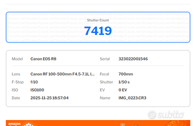 Vendo Canon R8 acquistata a fine luglio 2025 come secondo corpo, quindi praticamente ancora 1 anno e mezzo di garanzia Canon Italia ufficiale. Scatti 7500 circa, quindi praticamente nuova.