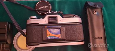 Macchina fotografica Canon AE-1 con obiettivo 50 mm. Si vende corredata di flash Toshiba e power winder Canon in custodia originale. Disponibili in altro annuncio obiettivo 135 mm Canon e teleobiettivo 55/300 Soligor.