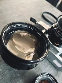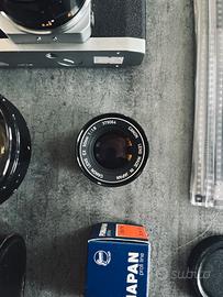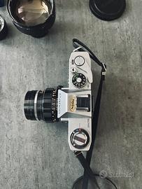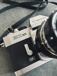 Vendo una Canon EX Auto QL, reflex a pellicola del 1972, in condizioni eccellenti e perfettamente funzionante. Si tratta di un modello particolare con un sistema di obiettivi intercambiabili che permette di sostituire solo la parte frontale della lente, lasciando fissa la parte posteriore. Il sistema Quick Loading (QL) facilita il caricamento della pellicola, rendendolo rapido e intuitivo.