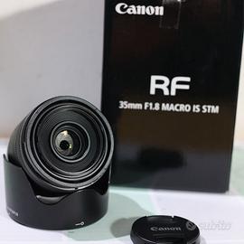 Canon RF 35mm f1.8 Macro IS STM completo di tappi e paraluce compatibile dedicatro JJC (Meglio dell’originale), in condizioni pari al nuovo, completo di imballo. Lente dalle prestazioni ottiche eccezionali per non essere un serie L è stato utilizzato pochissimo (Prediligo l'utilizzo di zoom). Utilizzato sempre con filtro Protector Canon, non incluso nella vendita, privo di polvere funghi o segni di usura.