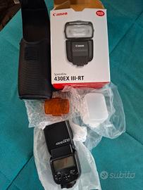 Compreso speedlite flash 430ex III con filtri giallo per luce calda e bianco per diffondere la luce.