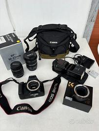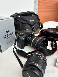 - corpo macchina Canon 550D - lente EF-S 10/22mm f3.5/4.5 - lente EF-S 18/55mm f3.5/5.6 - flash esterno Neewer - adattatore reflex/mirrorless - caricabatteria - zaino Canon
