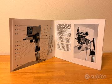 Il catalogo presenta copertina a colori con immagine dell’ingranditore e pagine interne in bianco e nero con fotografie, schemi numerati e descrizioni dettagliate dei componenti, delle regolazioni e delle modalità di utilizzo dell’apparecchio. Testi in lingua italiana, con impaginazione tecnica tipica del materiale professionale per camera oscura.