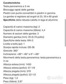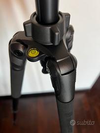 Gambe regolabili fino 25 gradi. Anello di serraggio che consente la regolazione della colonna e anello antiurto che previene le vibrazioni della fotocamera. Livella a bolla, gancio staccabile per la colonna centrale per agganciare più peso e garantire maggiore stabilità, piedini in gomma antiscivolo, blocchi rapidi delle gambe, attacco rapido rimovibile e due impugnature in schiuma.
