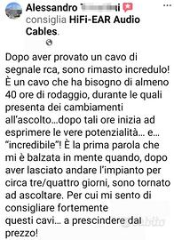 Cavi rca DIREZIONALI,nanotech U.S.A. ,come solo loro sanno essere competitivi nel settore un double shield ultra ofcc 8N 100% puro ultraflessibile (rame in assenza di ossigeno),low noice (basso rumore),plugs XLR rodiati di altissima qualità audio.