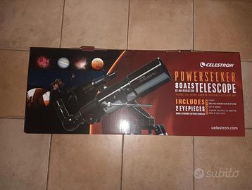Vendo Telescopio Celestron Powerseeker 80azs Perfettamente funzionante. Con scatola orginiale. Incluso supporto per cellulare Celestron NextYZ, mai usato. (valore accessorio 40€). Non dispongo dell'oculare SR4mm (100X) Preferisco ritiro a mano. Altrimenti spedizione da concordare.