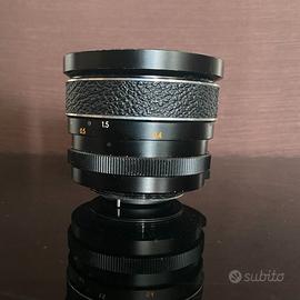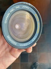 Grandangolo della Chinon, produttore terze parti per marchi blasonati, di origine Tomioka. Bellissimo con questa livrea ed è piuttosto raro, ha attacco a vite M42 adattabile a fotocamere digitali con effetti davvero particolari, specialmente lo sfuocato. Messa a fuoco fluida, diaframmi scattanti, lenti pulite ad eccezione di micro granuli di polvere come tipico nelle lenti vintage, non influenzano però l'effetto finale tanto sono minuscoli. Un piccolo segno sulla lente frontale anch'esso ininfluente sul risultato finale, e dei denti sulla ghiera che tuttavia non impediscono l'inserimento del filtro. Arriva con la sua custodia originale.