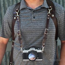 Nuovo accessorio per doppia tracolla,color caffé,che consente l'aggancio di una terza fotocamera ad una doppia tracolla per fotocamere.